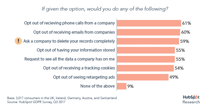 Pentru consumatori dreptul de a fi uitat sau șters din baza de date este ceva ce par dispuși să pună în practică – conform unui sondaj efectuat de Hubspot 59% dintre consumatori, dacă ar avea posibilitatea, ar cere unei companii să șteargă toate datele pe care le are despre ei.